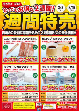 週間特売のおしらせ! こんにちは!モダンプロ津山店です! 週間特売のお知らせです! 割りばし、紙コップ、マスク、使い捨てエプロン どれもお安くなっております! ご来店お待ちしております! ツイート 2026年03月05日 09:35